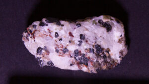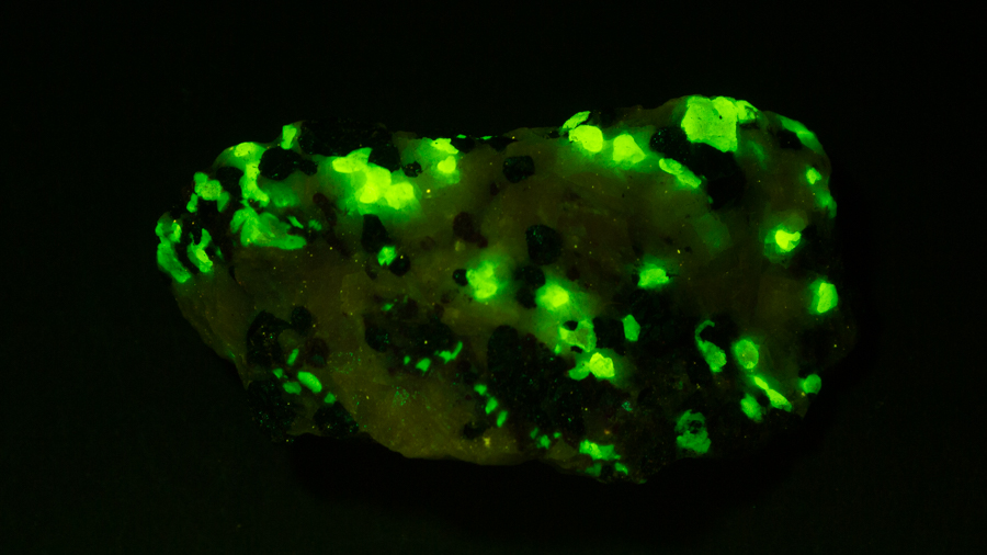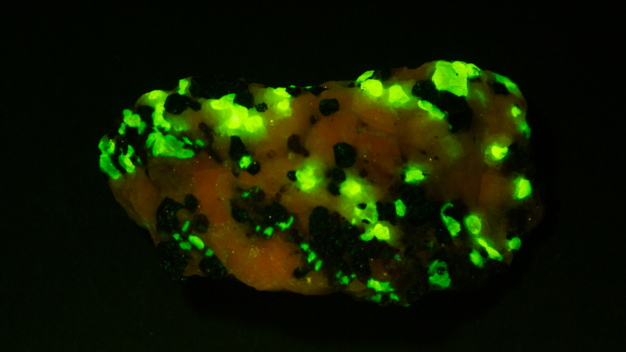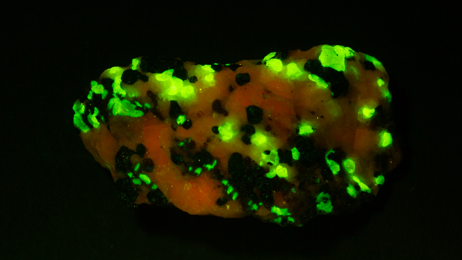 Given that background, I became intrigued by a seemingly odd photographic observation of a mineral specimen that appeared to be fluorescent – there was no glow-in-the-dark effect that I could see. This was a specimen containing calcite and willemite that came from the Sterling Hill Mine, in an area of New Jersey that is especially rich in fluorescent minerals.
