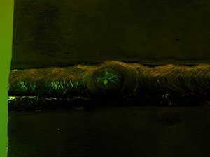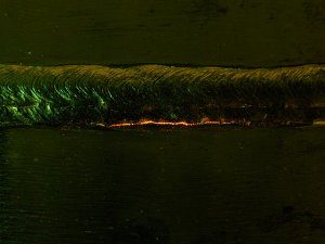 | There is a flaw in the toe of the weld, on the side facing the camera. The flaw was prepared with orange-fluorescent Circle DP93 magnetic particles using an AC yoke. |