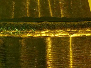 | This photograph was taken with the test plate in full sun (note the bright streaks from the machining marks). Even though the background light is very evident the penetrant indications can be seen easily. The background appears yellow because of the yellow filter on the camera. |