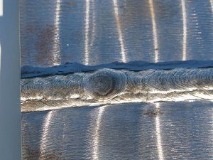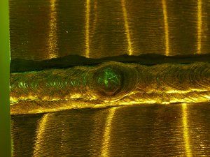 | There are fine cracks in the depression on top of the weld. They were prepared with penetrant using Magnaflux ZL67 followed by wiping with an alcohol swab. No developer was used. |