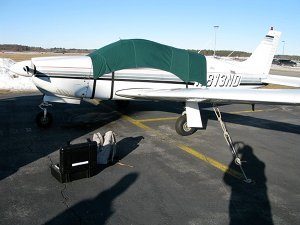| A small plane parked on the ramp was used as the background for the tests. Note the strong shadows. |