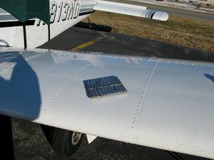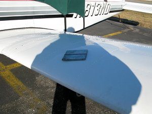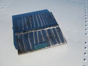 | The test subject was a Sonaspection test plate placed on the wing of the plane in full sun. Note the bright streaks caused by reflections from machining marks on the plate. These will appear in the photographs taken in full sun. |