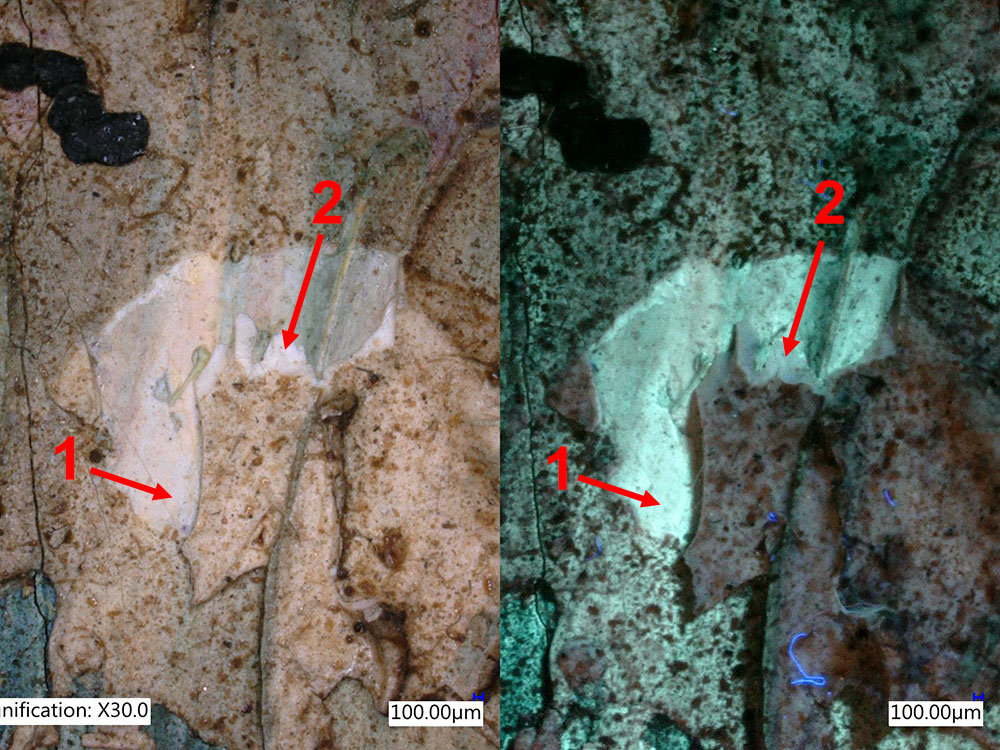 The images below were acquired at the Heritage Conservation Centre, National Heritage Board, Singapore, using a Keyence VHX-6000 microscope with the VH-Z20 lens mounted on a mobile stand and a NIGHTSEA UV excitation/emission set. Thin brown varnish over zinc white ground. The fluorescence of the patch that appears fairly uniformly pale in the white-light image (left) arises from zinc white. The difference in brightness of the UV-excited fluorescence results from a later retouching/alteration. It was found that the more brightly fluorescent area (1) was older than the less fluorescent area (2).