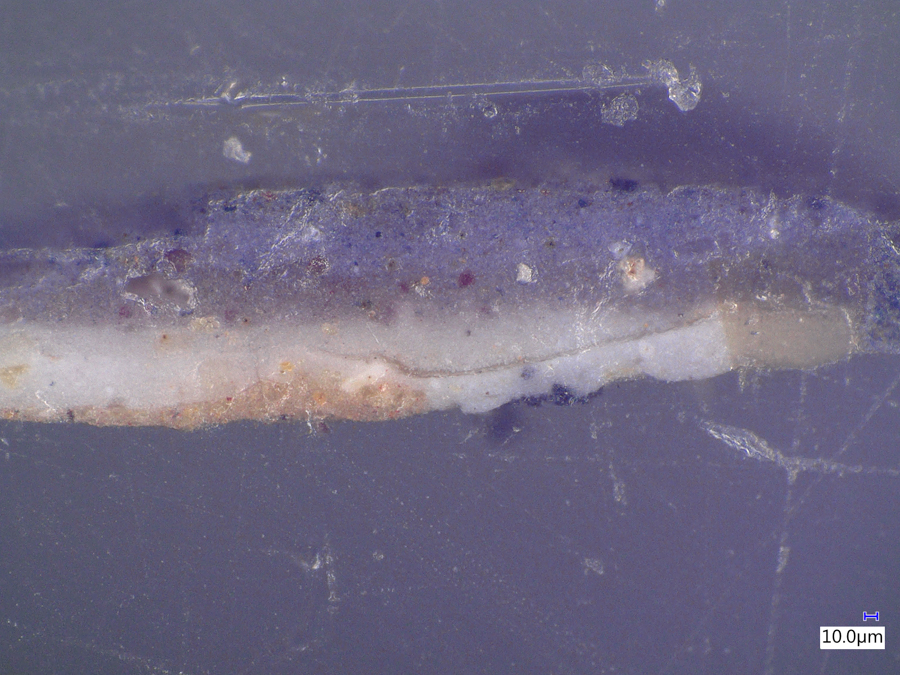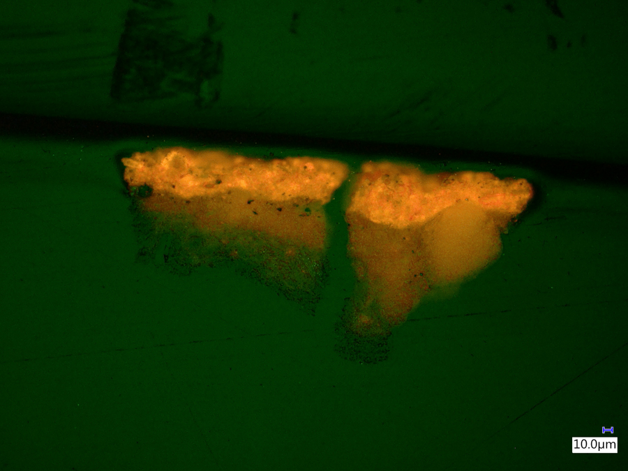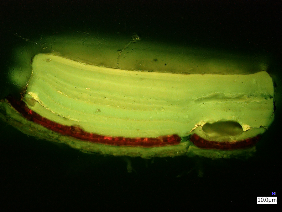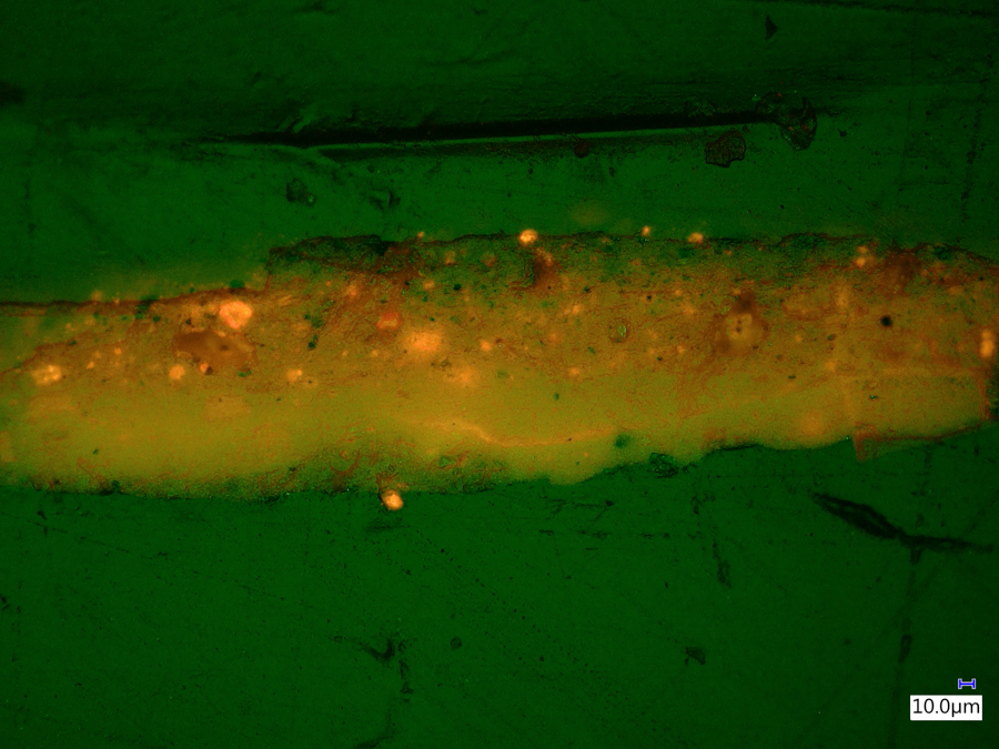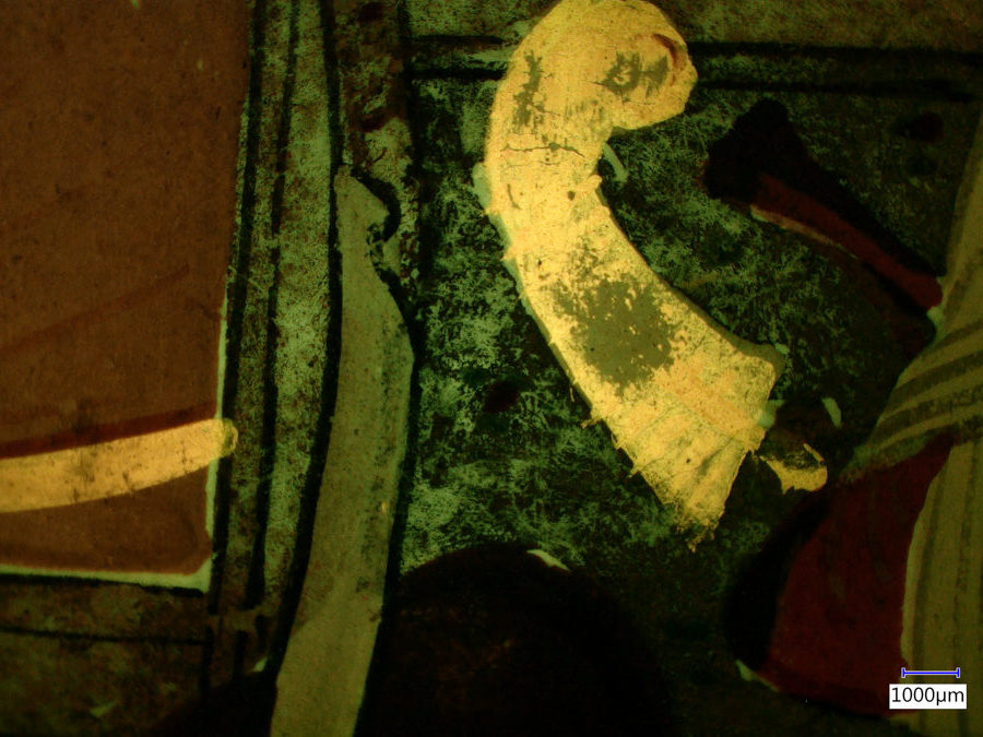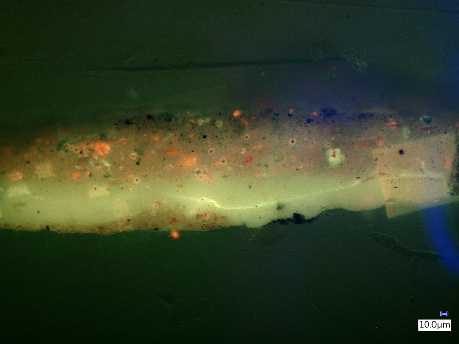 The images below were made at the Straus Conservation Laboratory at the Harvard Art Museum. They were made with the NIGHTSEA Royal Blue or Cyan excitation/emission sets, as noted, on a Keyence VHX-6000 microscope with the VH-ZST lens.