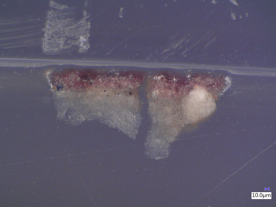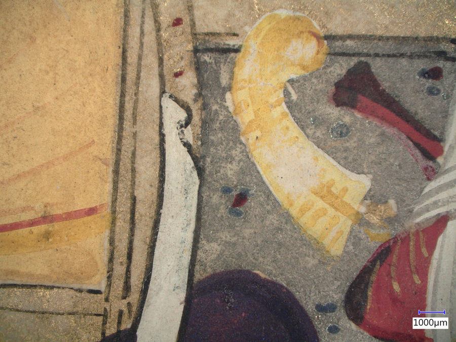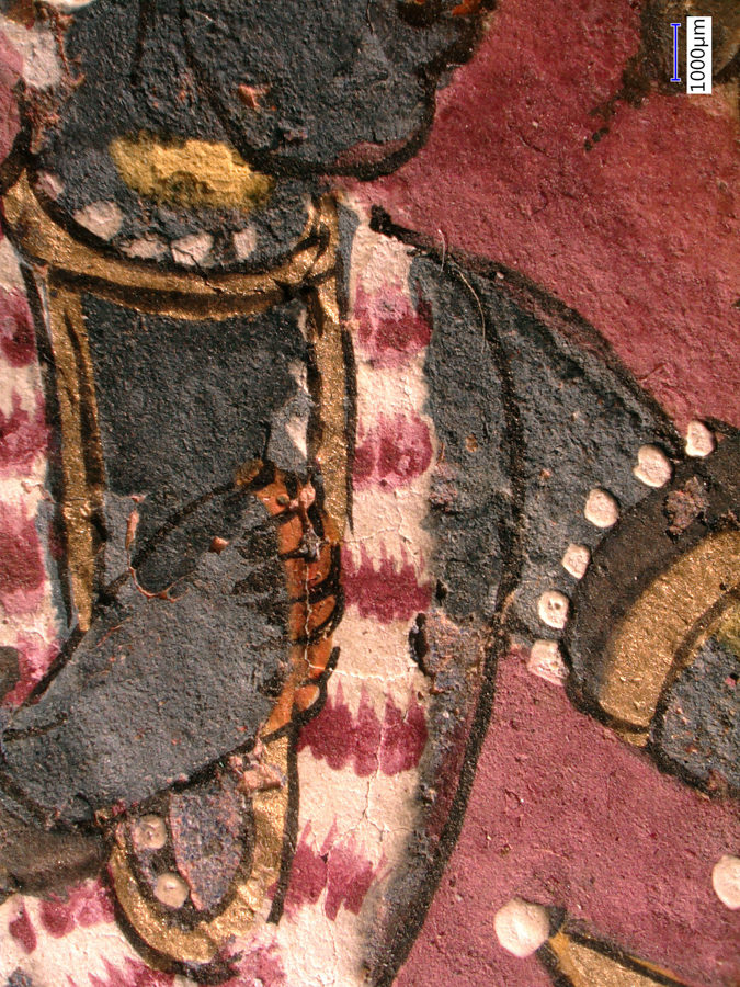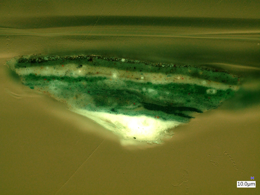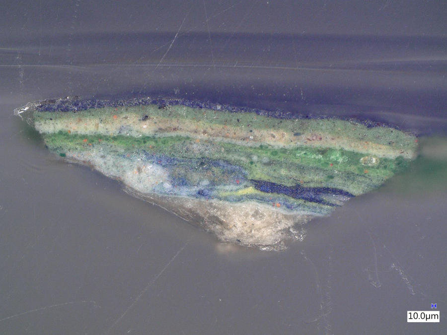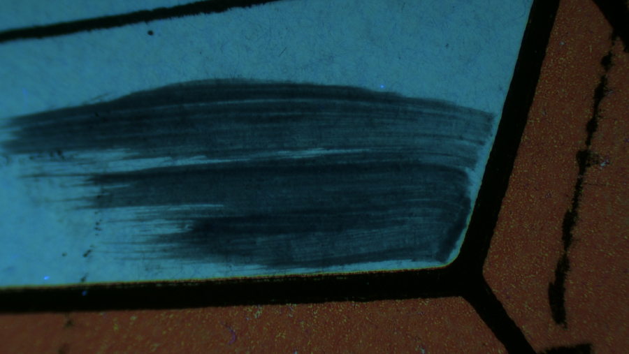 The images below were made at the Straus Conservation Laboratory at the Harvard Art Museum. They were made with the NIGHTSEA Royal Blue or Cyan excitation/emission sets, as noted, on a Keyence VHX-6000 microscope with the VH-ZST lens.