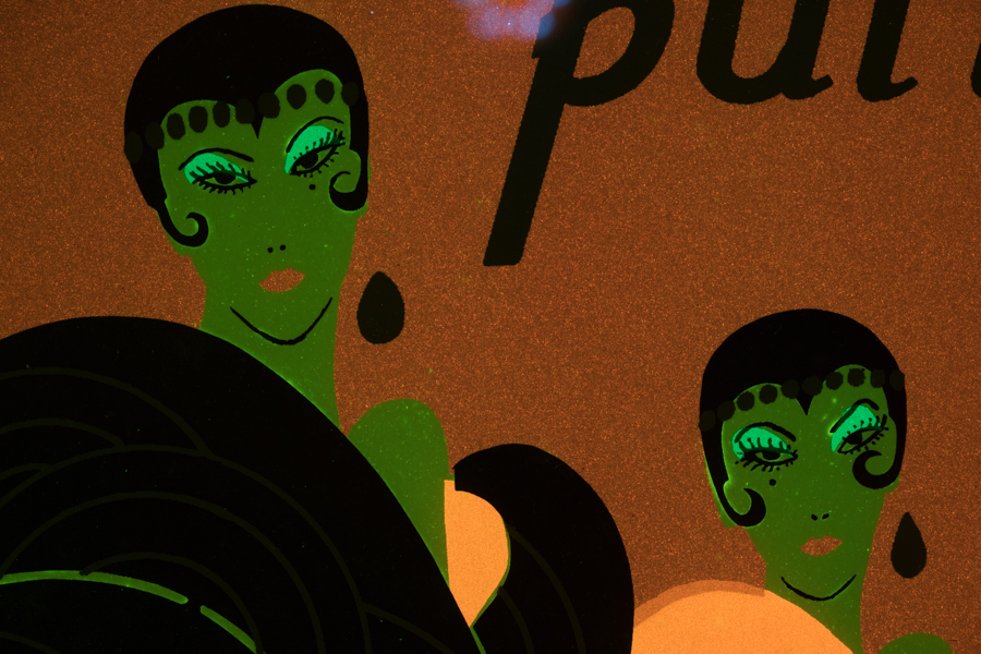 This example shows a poster made for the 1992 Carnival in Provincetown, MA. We found this print mounted on the wall of a B&B in Provincetown and photographed it with Royal Blue excitation.
