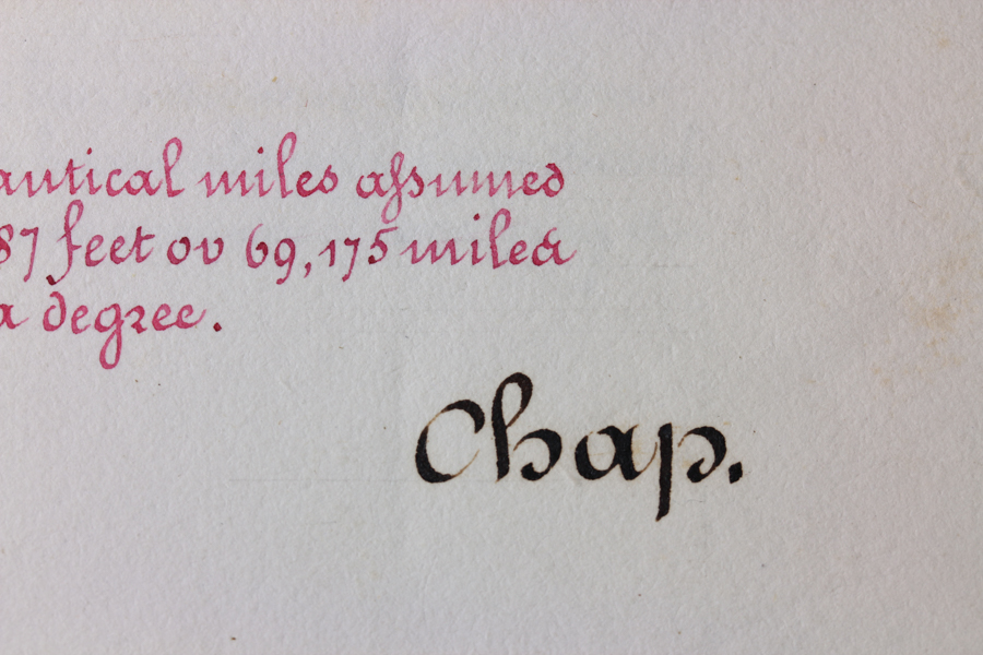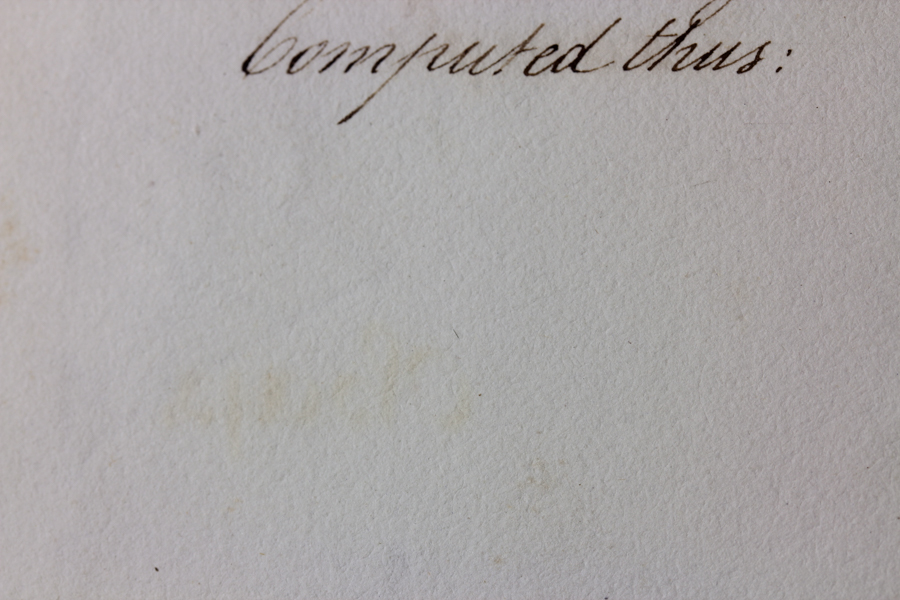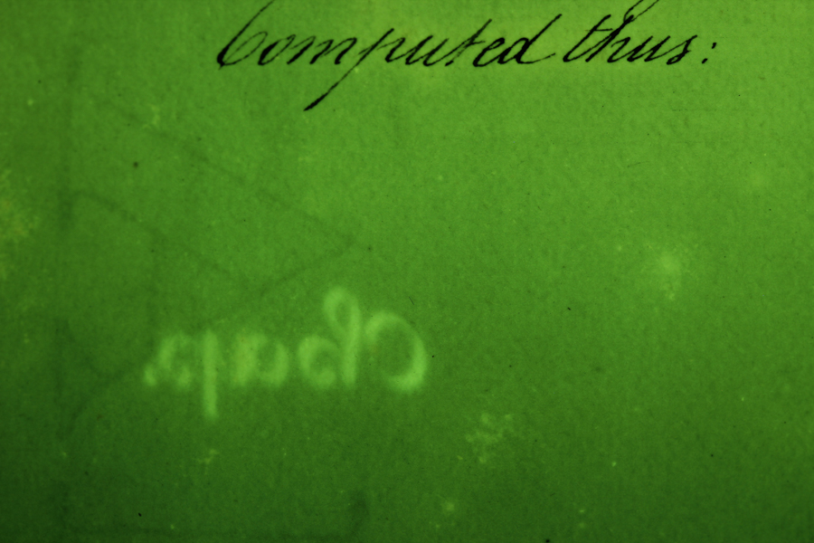 Fluorescence can reveal interesting features in paper. The images below were made of a c. 1800, beautifully bound and executed handwritten report on naval architecture experiments conducted in the 1790’s. We observed that all of the black ink could be seen on the facing sheet as an area of lighter fluorescence. According to an expert we consulted, this is due to transfer of unbound iron ions in the iron gall ink to the opposite page, where they form Iron (II) oxide. The fluorescence is not from the iron, but from chemical changes in the paper.