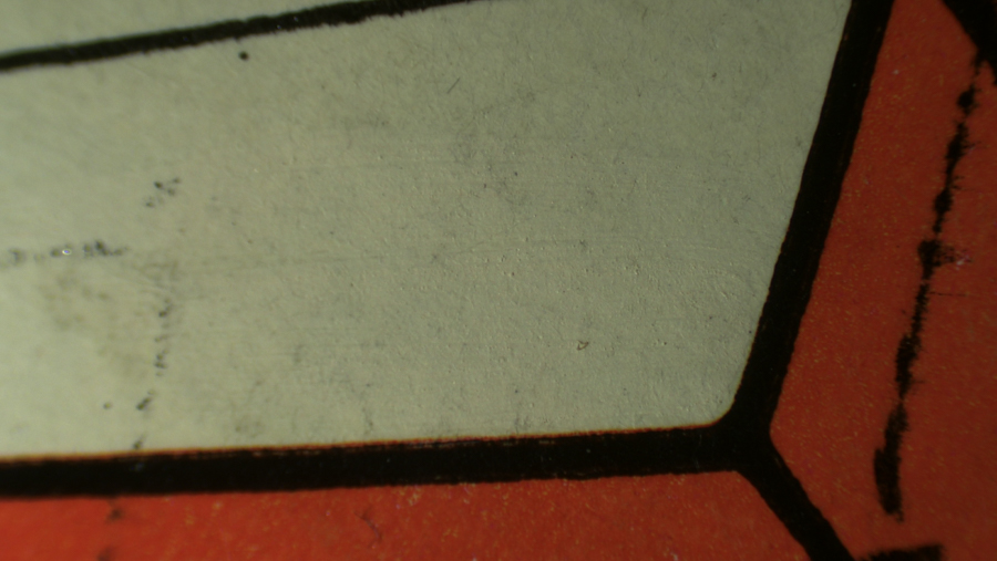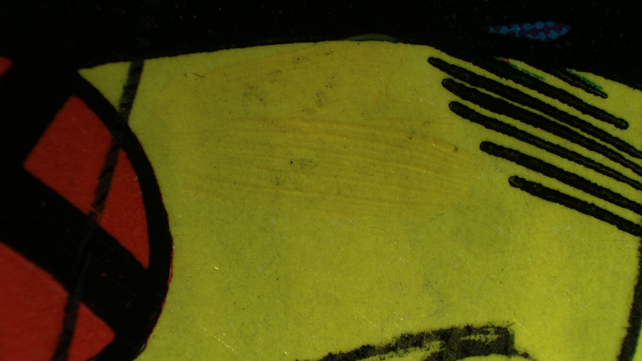 Fluorescence can potentially help to find areas of where restoration has been done. Someone sent us a classic comic book to see if fluorescence would show the touch-ups. As often happens fluorescence was not a universal panacea, and some areas did not show up particularly well. But in others fluorescence revealed the restorations dramatically. In some cases it was the touch-up itself that fluoresced, while in other cases it showed up dark against the natural fluorescence of the background.