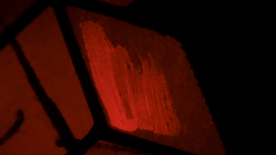 The two images below were acquired at the Eskenazi Museum of Art at Indiana University, Center for Conservation, using the Hirox RH-2000 Digital Microscope System and the NIGHTSEA Ultraviolet excitation/emission set. They were able to document an area of the painting ‘Joseph Seeking His Brothers‘ (Eustache Le Sueur, ca. 1647–1650) with some remaining original 17th century red oil paint (likely vermilion) surrounded by modern (approx. 50 years old) overpaint. The original paint exhibits a red fluorescence (below right), while the overpaint does not (white light image, below left).