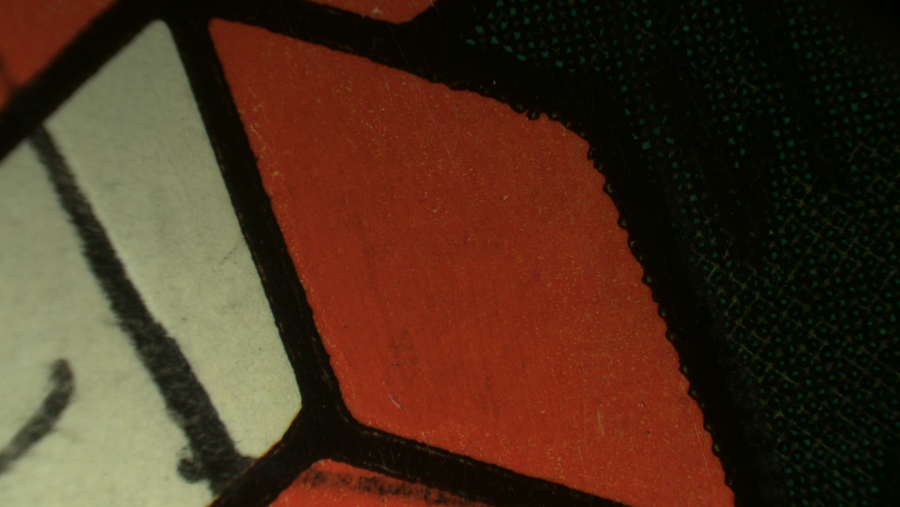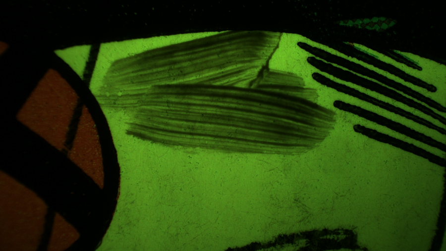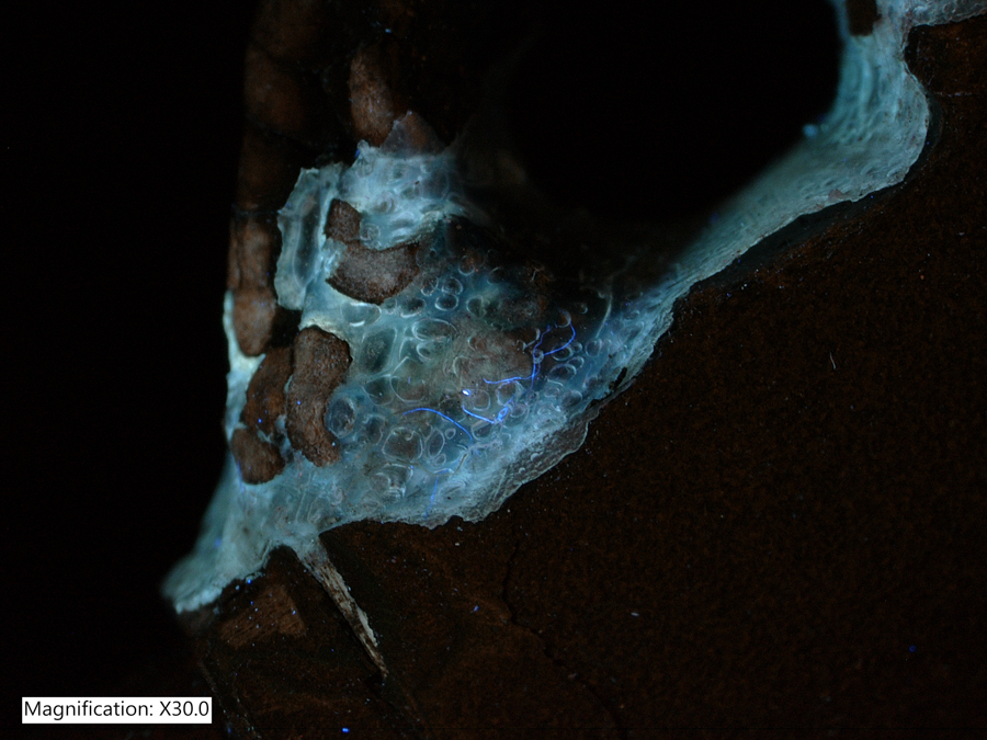 1. Synthetic adhesive on Japanese lacquer pipe case (Kiseruzutsu). Image made with a Keyence VHX-6000 microscope with VH-Z20 lens, NIGHTSEA Ultraviolet excitation.
