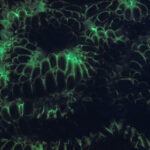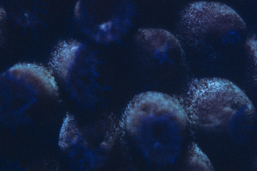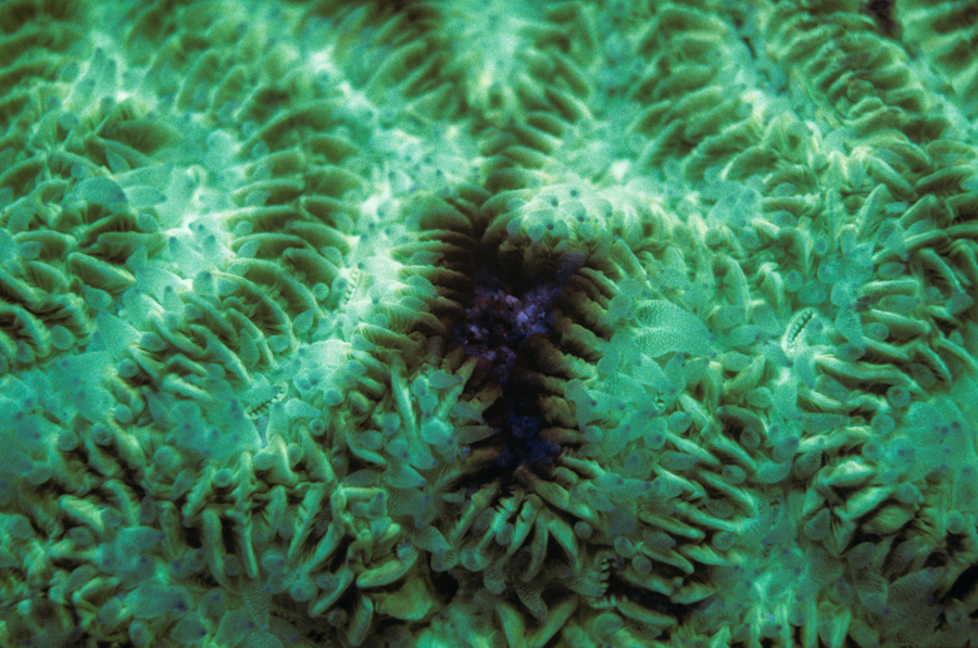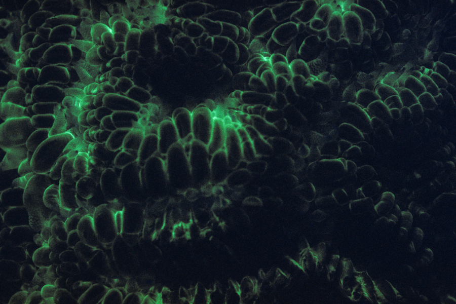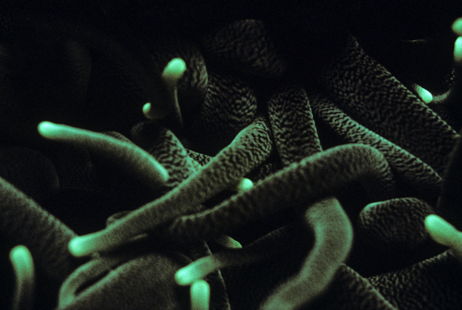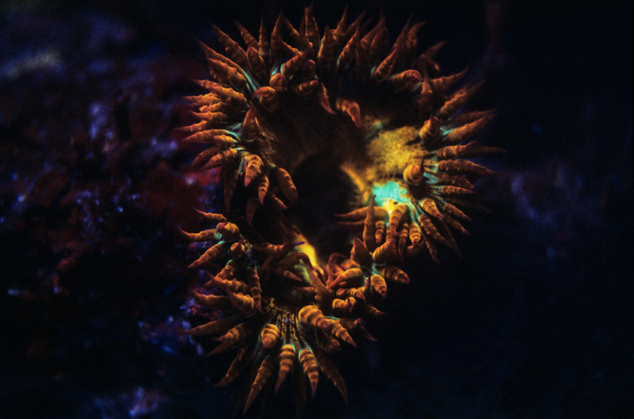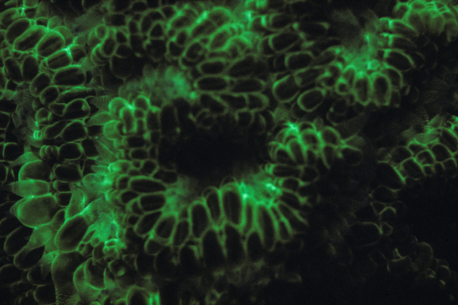 The two fluorescence images illustrate something about fluorescence photography that you sometimes just have to deal with. Some subjects, in this case the corallimorpharian Ricordea florida, may have more than one fluorescing molecule within them, and one may fluoresce significantly more intensely than the the other. That is the case here. The green fluorescence arises from proteins in the GFP family in the host tissues. In the middle shot above, PB0009Fb, you can also see a reddish-orange fluorescence in the tentacles. This likely arises from chlorophyll in endosymbiotic algae. This fluorescence is much weaker than the green, so in order to capture it the green comes out overexposed. F0009Fa – f5.6, F0009b – f2.5.