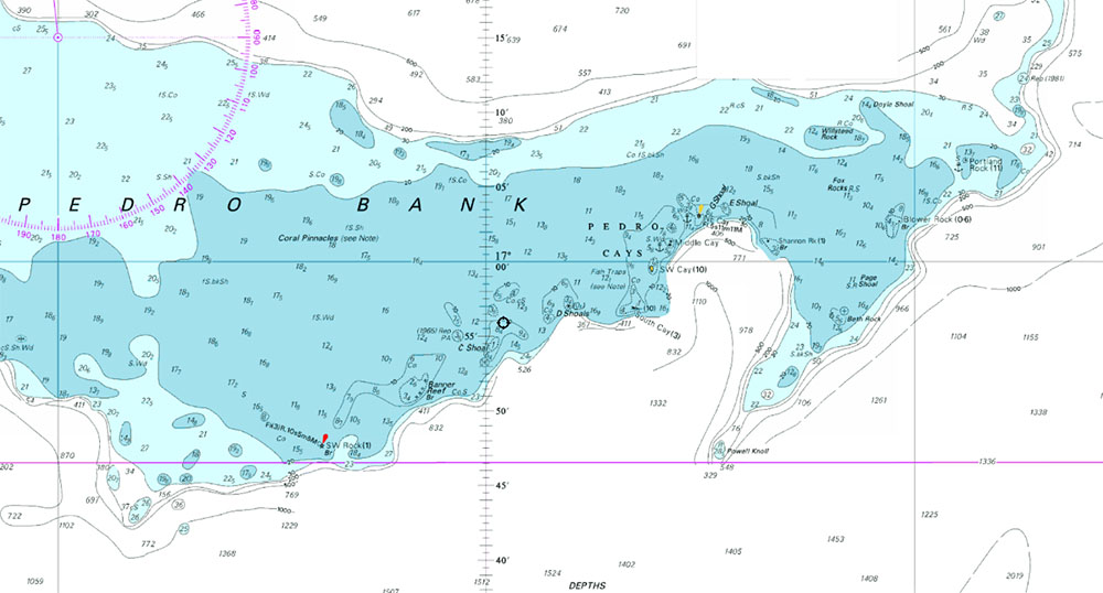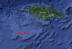 Pedro Bank is a plateau that rises out of the surrounding deep waters of the Caribbean. Much of the Bank is navigable, but the southeastern edge is dotted with a series of shoals. Its position in the middle of what seems to be open sea with no high points of land to mark it has made it a death trap for ships through the centuries.