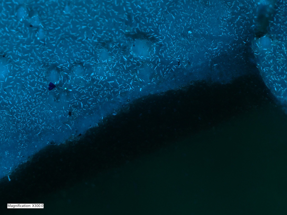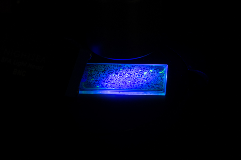 We are pleased to announce the availability of a new accessory for our systems for adding fluorescence to the Keyence series of digital microscopes. The new adapter for the VH-Z100 lens enables you to mount our excitation light heads in place of the Keyence light source. It attaches magnetically, exactly like the Keyence light source fixture. This directs the excitation light onto your sample from above, providing more intense illumination than directing the light in from the side.
